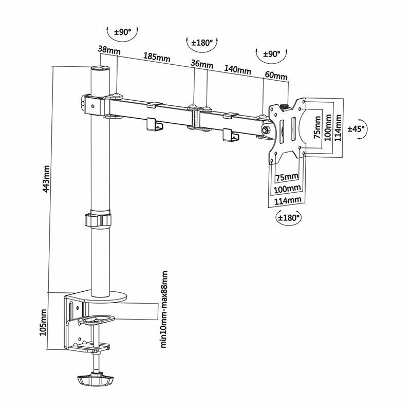 - Angulo de Inclinación: -45º / +45º. Angulo máximo de giro: 360º (depende de la instalación y del espacio disponible). Ángulo máximo de rotación: 180º