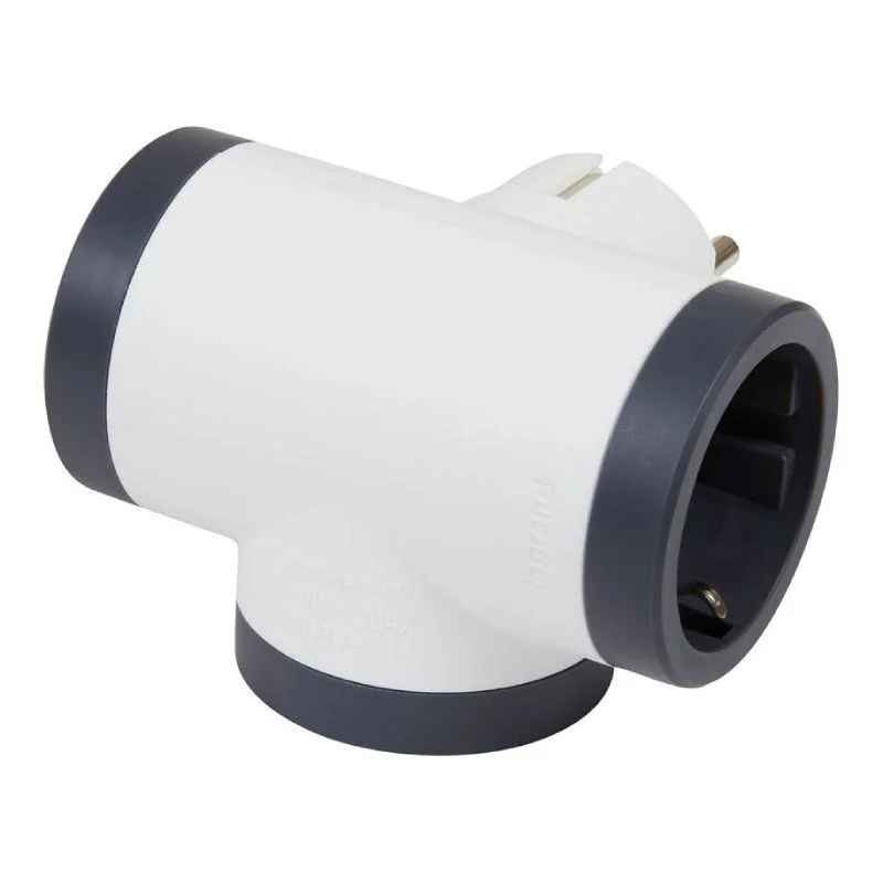 - Adaptador triple, 3 tomas laterales 2P+T.