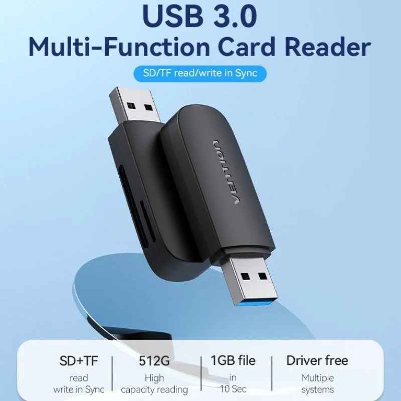 El lector de tarjetas Vention USB 3.0 expande fácilmente la ranura SD y TF en su PC para leer y escribir tarjetas. Puedes leer y escribir en dos tarjetas simultáneamente para mantenerte alejado de la molestia de desenchufar y volver a enchufar constantemente.