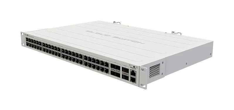 El Mikrotik CRS354-48G-4S+2Q+RM es un switch de red L2 gestionado diseñado para facilitar la gestión y expansión eficiente de la red. Dispone de 48 puertos Ethernet RJ-45 de conmutación básica que soportan velocidades Gigabit Ethernet (10/100/1000), lo que permite una amplia gama de dispositivos y casos de uso. La unidad también incluye un puerto de consola con una interfaz RJ-45 para la gestión directa de dispositivos.