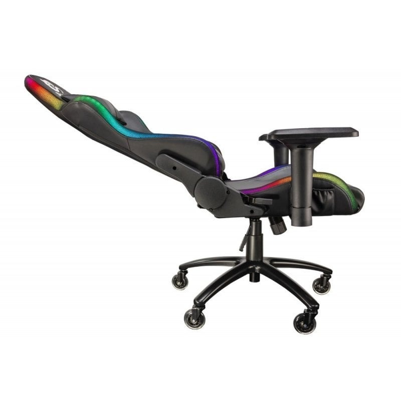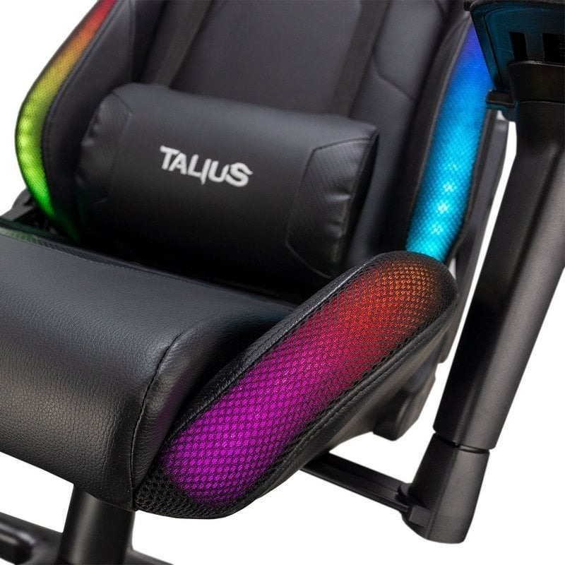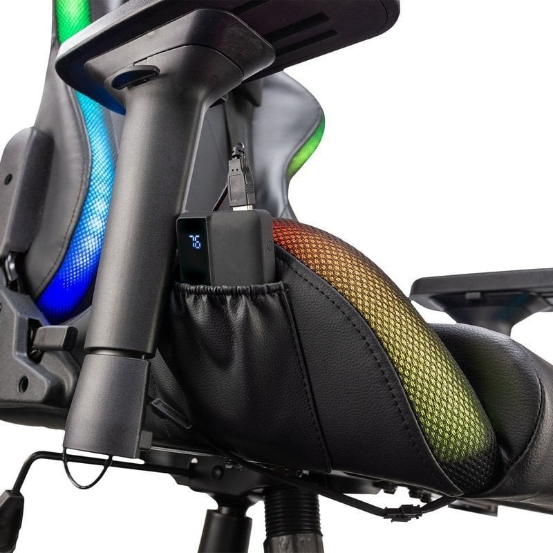 Silla Camaleon de Talius, hecha para brillar. Las bandas LED con un total de 366 modos de iluminación quedan perfectamente integradas en los perfiles de la silla. Para una movilidad total puedes optar por alimentar la silla mediante un PowerBank, que podrás esconder en el bolsillo lateral.