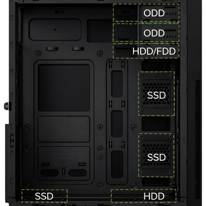 - Soporte ventilador trasero: 80 mm / 90 mm